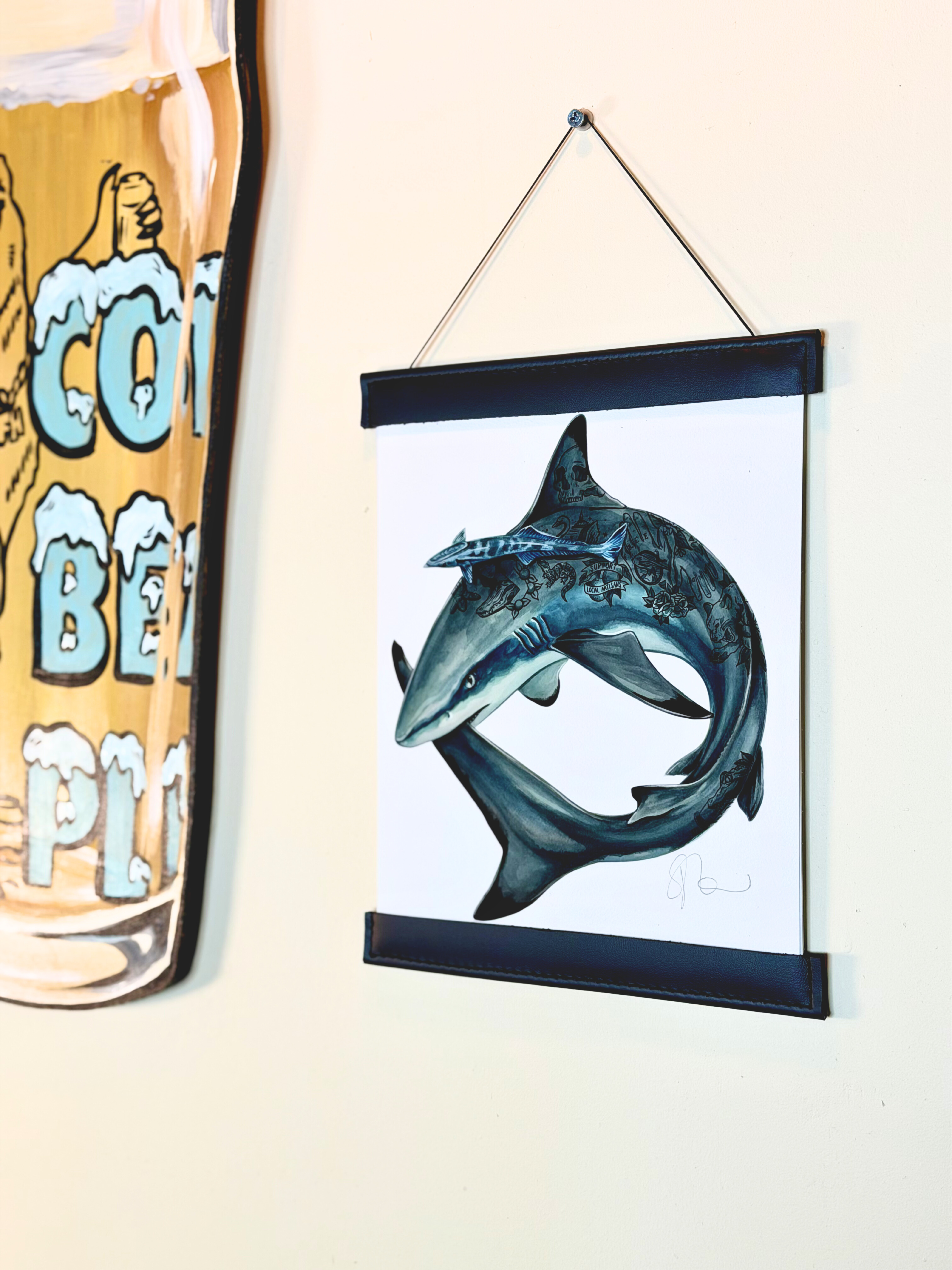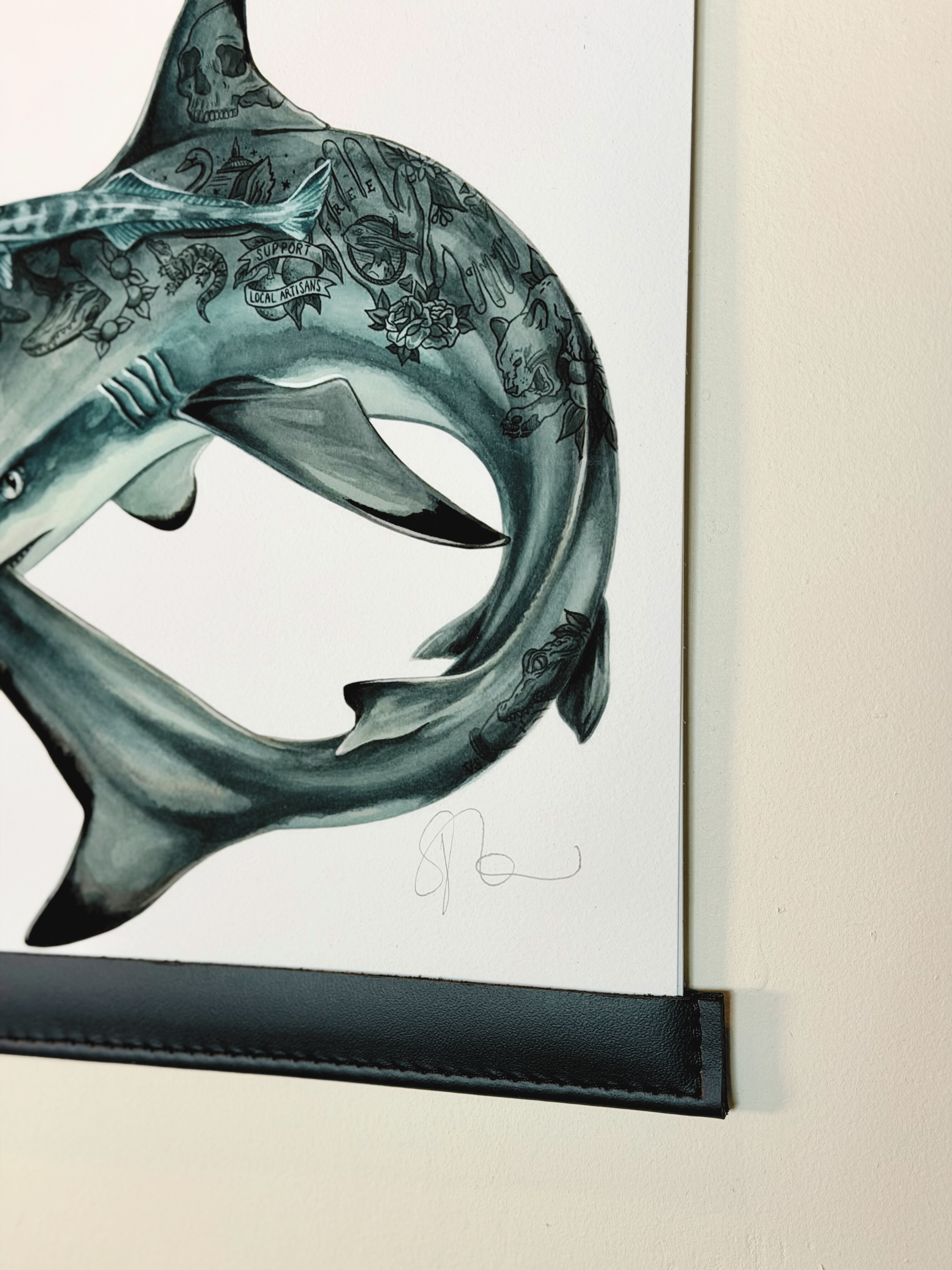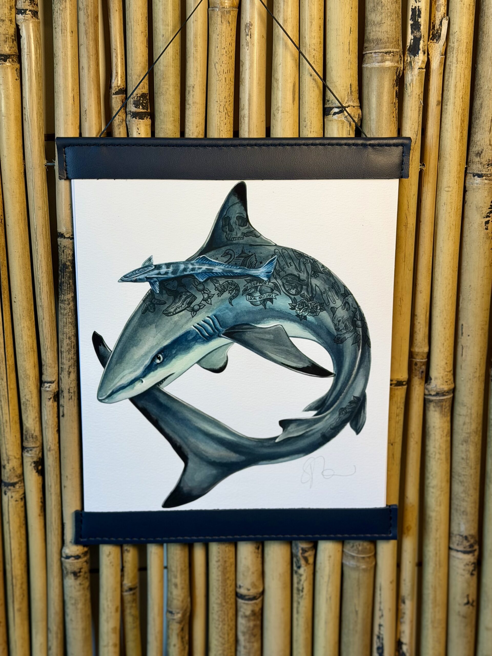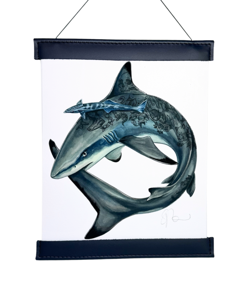 To commemorate our 10-year anniversary, we’ve produced only 25 Collector’s Edition Art Prints featuring our Blacktip Shark Ouroboros. The prints have been carefully sewn into a navy veg-tan leather frame for hanging in your home, office, gallery or wherever you keep your FHG art. Seth built these one by one to fit the 8×10″ art prints on textured paper. They come signed by the artist, Veronica Steiner, & with a string for easy hanging.