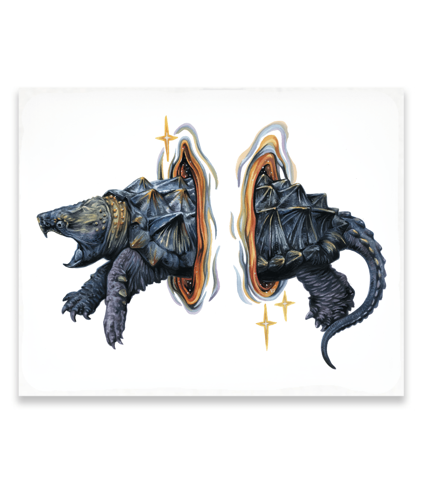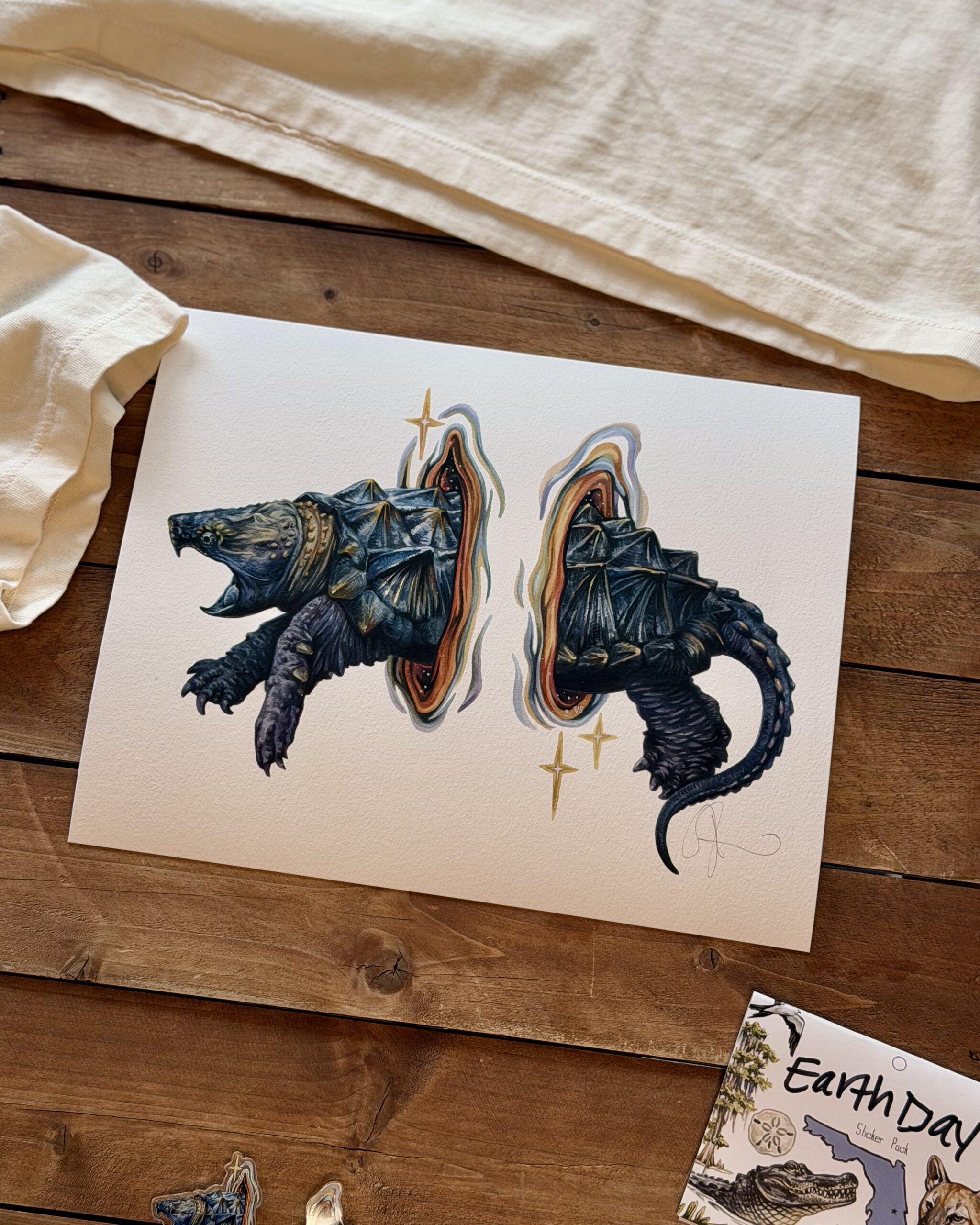 From one side of the wormhole to the other, this alligator snapping turtle has seen some stuff. V. Steiner’s new watercolor is the first design to drop in our 2026 Earth Day Collection.