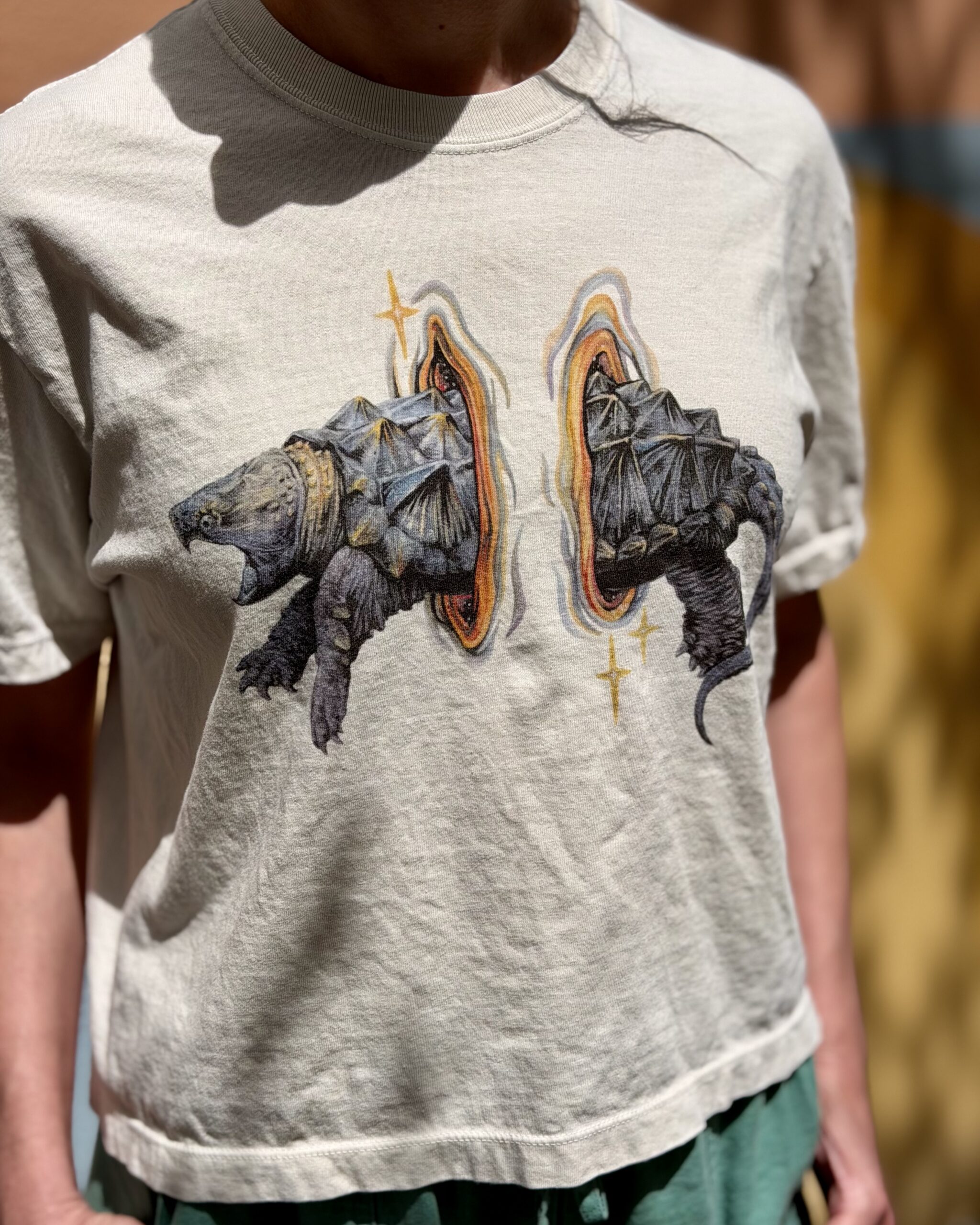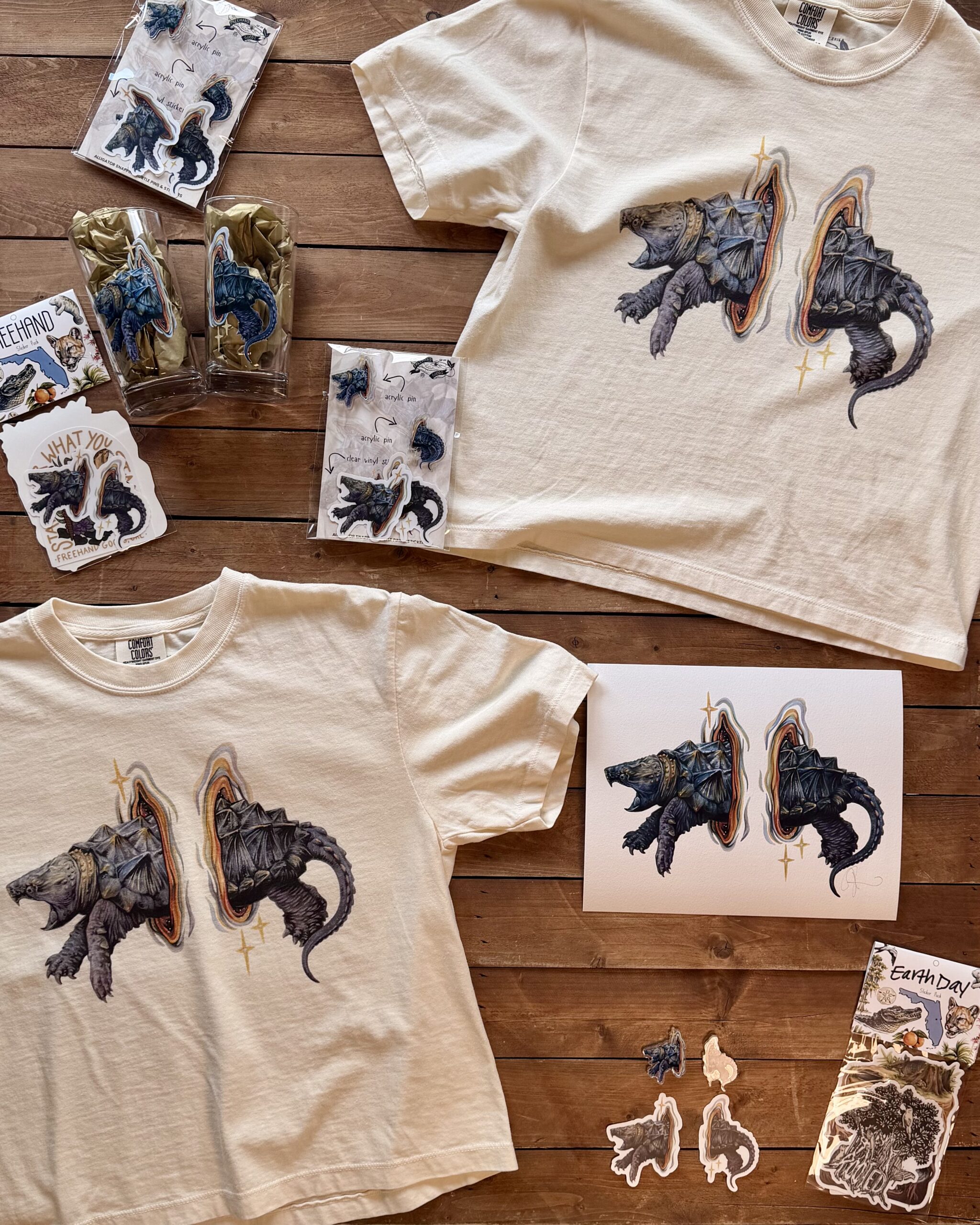 From one side of the wormhole to the other, this alligator snapping turtle has seen some stuff. V. Steiner’s new watercolor is the first design to drop in our 2026 Earth Day Collection.