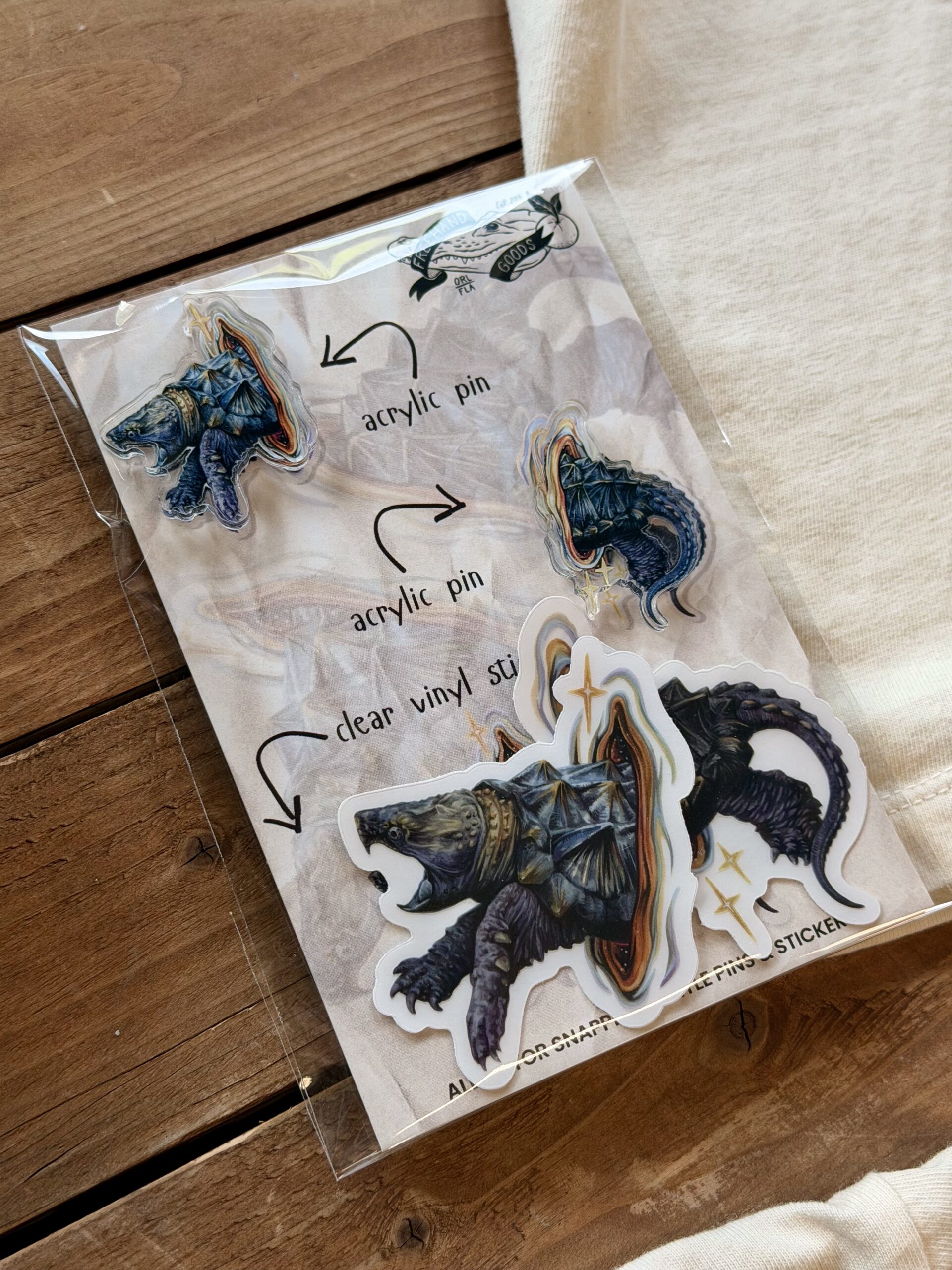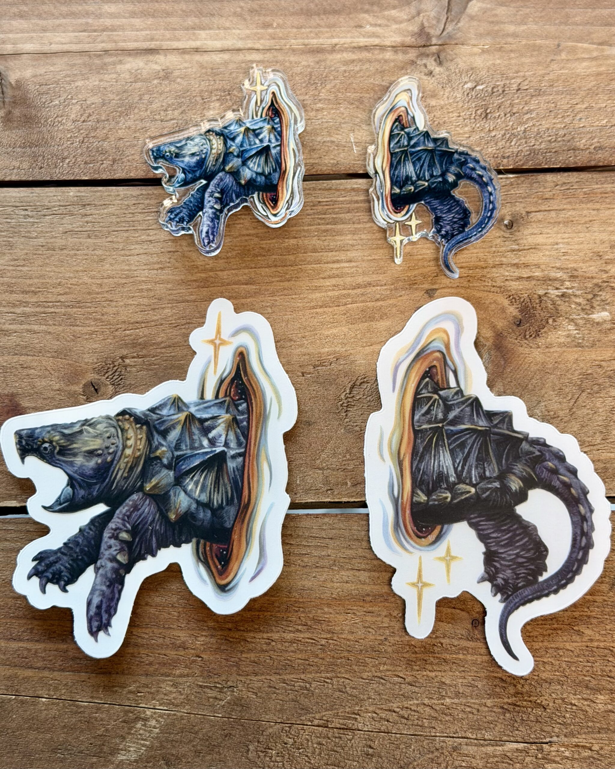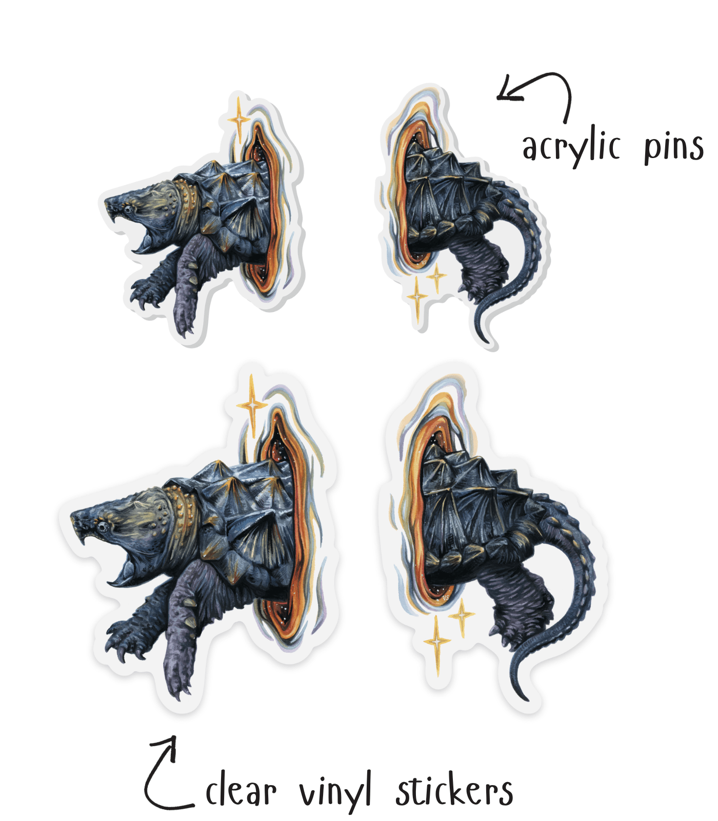 What’s included: two 1.75″ Alligator Snapping Turtle Acrylic Pins & two 3″ Alligator Snapping Turtle Clear Stickers