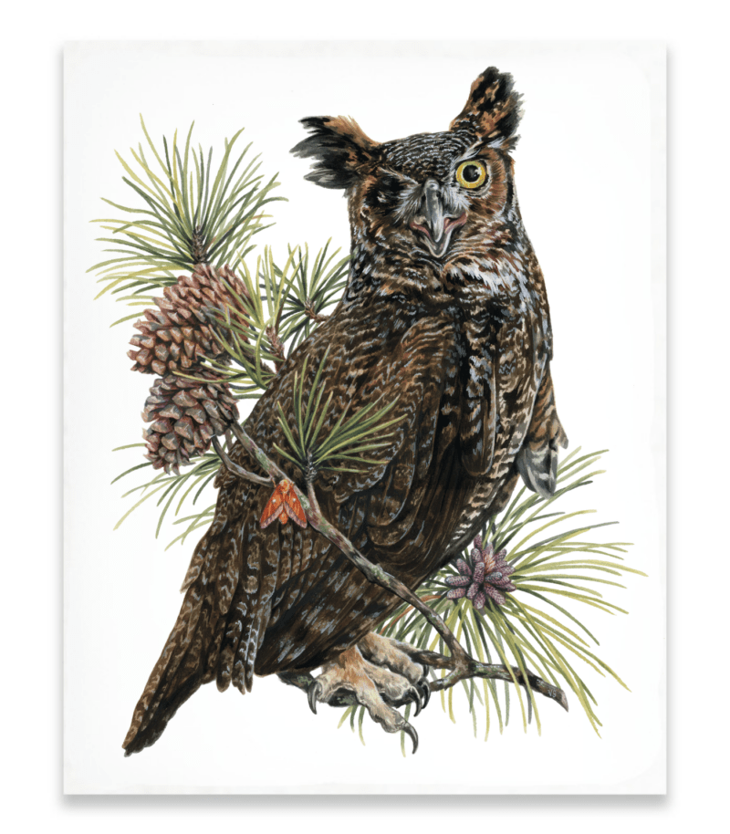 Columbo the Great Horned Owl arrived at Back To Nature Wildlife Refuge on January 21, 1995. She came in as an adult from Village Animal Hospital in Palm Bay. She had sustained injury to her right eye & it was believed to have been the result of a gunshot, causing her eye to be removed. Based on their sight to locate prey, Columbo would not have been able to survive on her own. This collaborative artwork by V. Steiner for Back To Nature Wildlife Refuge is a good reminder of what happens when humans interfere with the natural order of the forest.