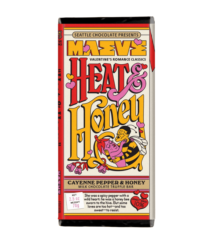 Sweet honey meets her match in fiery cayenne & milk chocolate heat. Made by Maeve Chocolate.