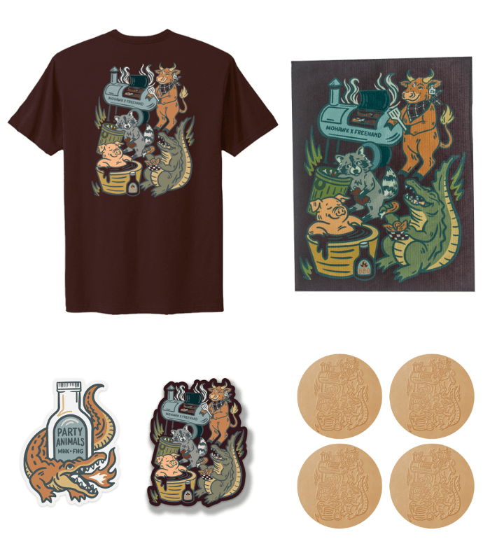 Our Party Animals teamed up with Orlando's Mohawk Smokehouse for a good ol' fashioned Florida BBQ. Steiner's newest artwork depicts all the usual suspects grillin' & chillin' in the backyard, the only way Floridians know how!