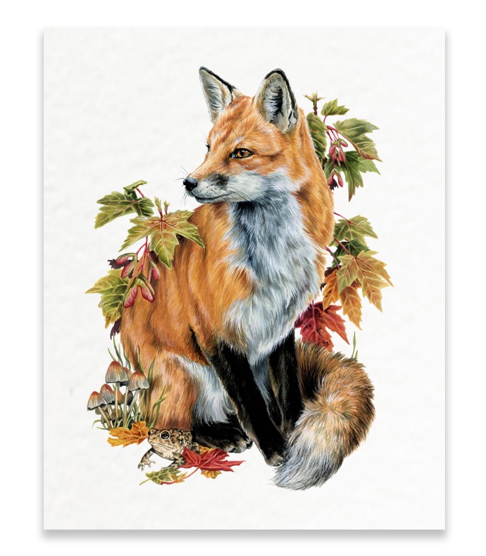 V. Steiner’s newest fall watercolor is here featuring the beautiful Red Fox, Red Maple, Southern Toad & Pinwheel Mushrooms. Each one of Steiner’s paintings takes around two weeks to create & we’ve captured all the details on this 8×10″ print for your home or office for years to come.